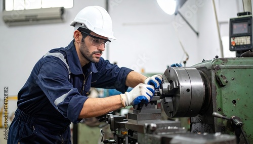 Male engineer in jumpsuit and white safety helmet precisely operating a lathe machine in a bright industrial workshop, focusing on precision metal cutting and machinery control