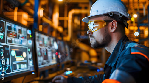 Male engineer working on a computer in a control room with multiple monitors displaying data and icons