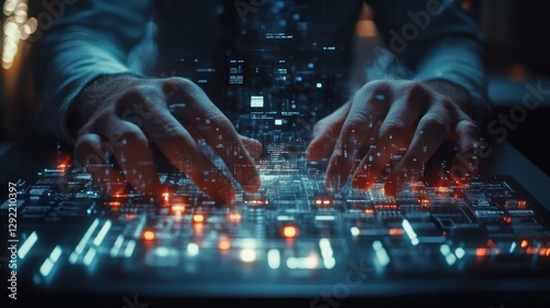 Male hacker typing on futuristic keyboard with digital interface and neon lights