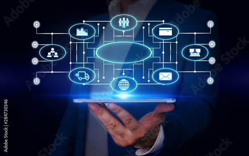 Male human wear formal work suit presenting presentation using smart device