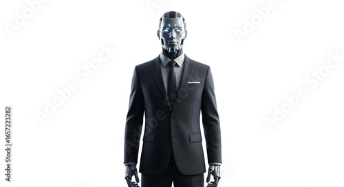 Male humanoid android wearing elegant tailored business suit with tie, metallic synthetic face with glowing accents, standing in formal confident posture, isolated on pure white background.