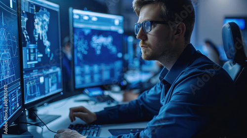 Male IT professional analyzing data on multiple computer monitors in a dark, high-tech office environment