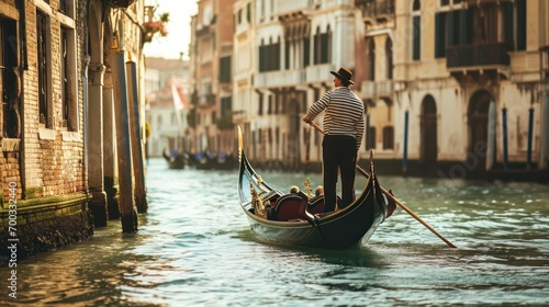 Male model as a traditional Venetian gondolier on the Grand Canal, culture and romance.