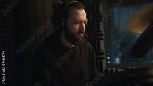 Male musician in headphones plays a drum kit. Drummer records song for musical rock band album in sound recording studio. Work in the music recording room. Music production concept. Zoom in.