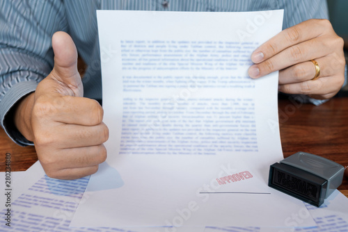 male point to signing business document for putting signature, fountain pen and approved stamped on a document, certificate contract agreement lawyer hand concept.