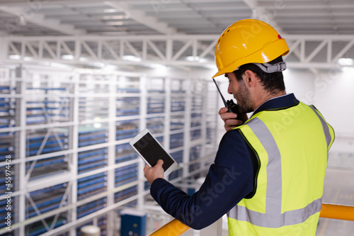 Male supervisor with digital tablet talking, using walkie-talkie on platform in factory