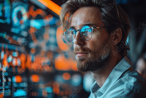 Male tech leader giving a keynote at a tech conference, large screen behind him displaying futuristic graphics, audience in shadow, spotlight effect
