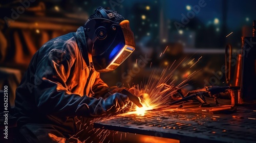 Male welder wearing helmet working with welding torch in factory. Generative AI