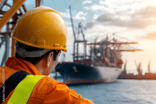 Male worker observing cargo ship at port in morning light