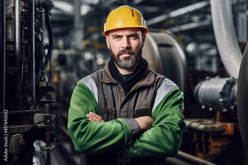 Male worker standing with arms crossed in factory Portrait of manual worker. Manufacturing professional standing with arms crossed by machine. He is in protective wear
