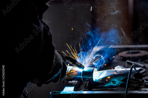 Male worker wearing protective gloves while repairing car exhaust pipe with welding machine