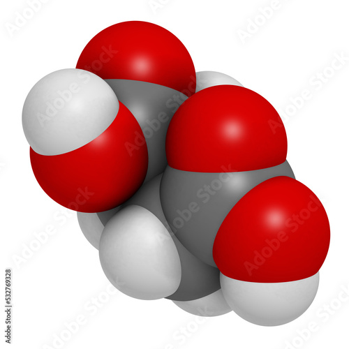 Malic acid fruit acid molecule. 3D rendering. Present in apples, grapes, rhubarb, etc and contributes to the sour taste of these.