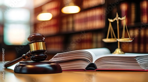 Mallet and legal book with a justice scale on a table, representing the legal profession.