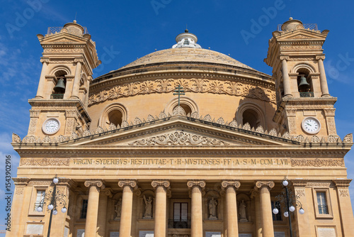 Malta, Mosta. Facade of the Sanctuary Basilica of the Assumption of Our Lady or Rotunda of Mosta. 17th century Catholic church. Third-largest unsupported dome in the world.