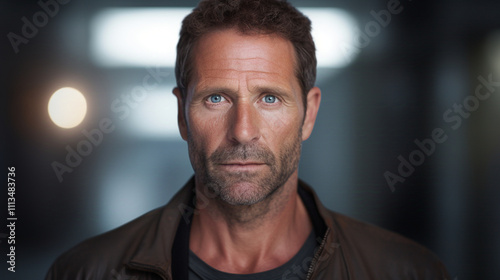 man, 40's, brown, very realistic skin texture, t-shirt and jacket, brightness, dark background