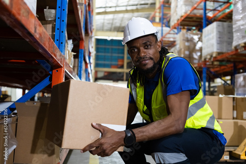 Man american african professional worker wearing safety uniform and hard hat holding box product on shelves in warehouse. Man worker check stock inspecting in storage logistic factory.