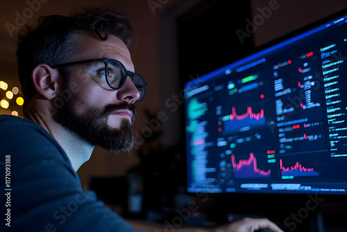 Man analyzing financial data at night, home office, charts, graphs, investment, stock market