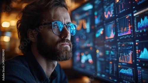Man Analyzing Financial Data on Multiple Screens