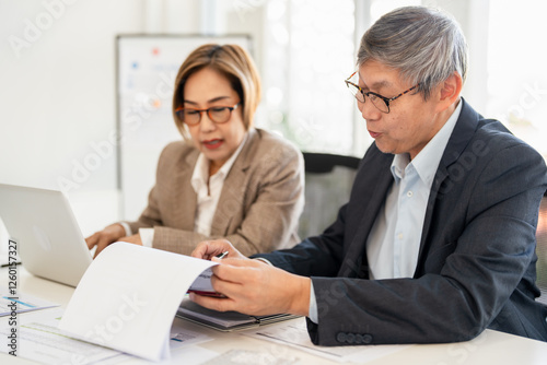 Man and woman are working on a presentation in meetimg room modern office. hand holding a clipboard with graphs and typing on a laptop.