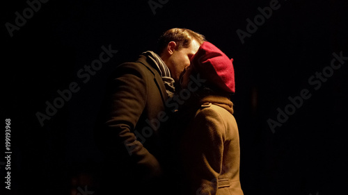 Man and woman kissing outdoors after night date, romantic relationship, love
