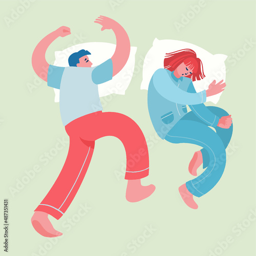 Man and woman sleeping. Young couple nap on pillows in their bed.