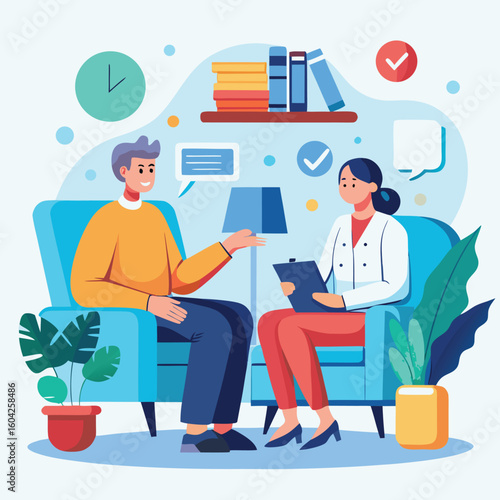 Man and woman talking in comfortable chairs with plants and books therapy session
