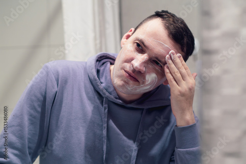 Man Applying Face Cream in Bathroom Mirror During Morning Routine for Skincare