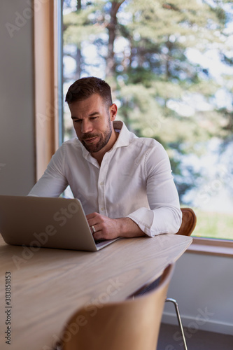 Man at home using laptop