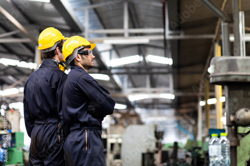 Man at work. Mechanical Engineer man in Hard Hat Wearing Safety..Jacket working in Heavy Industry Manufacturing Facility. Professional Engineer Operating lathe Machinery