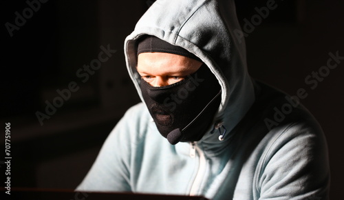 Man carder in mask connect to darknet search information bank system pc crack dark web uses stolen credit card cloud buy illegal services