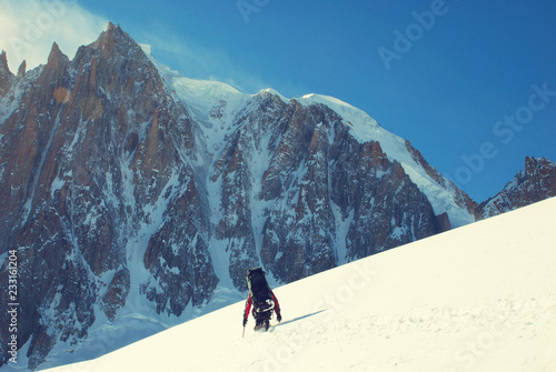 Man climber reaches the top of mountain peak. Climbing and mountaineering sport. Nepal mountains.