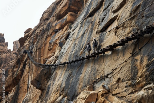Man Climbing Up Mountain Face, A network of ropes and anchors snakes its way up the cliff, a testament to the teamwork and preparation required for a successful ascent