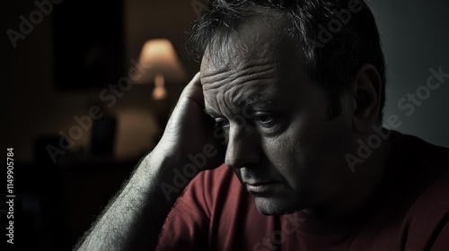 Man contemplates his thinning hair in a softly lit room, a moment of reflection on aging and self-awareness.