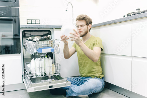 man does housework in the kitchen, loads the dishes in the dishwashe