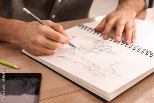 Man drawing in sketchbook with pencil at wooden table, closeup
