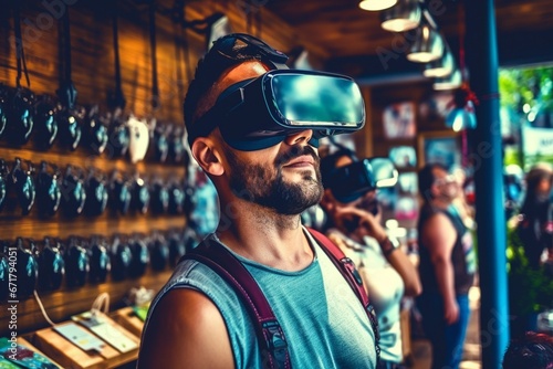Man Experiences Virtual Reality in Rustic Coffee Shop Environment
