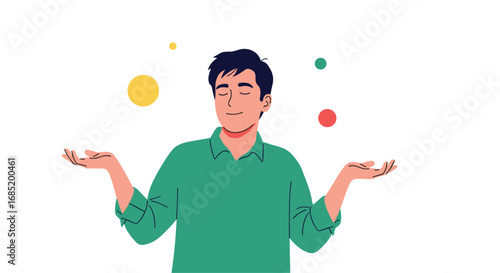 Man expertly juggling colored balls with eyes closed showing perfect balance and concentration