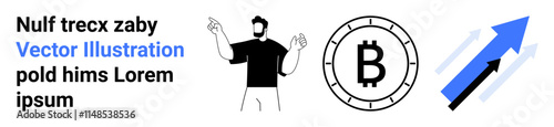 Man explaining, Bitcoin symbol in circular frame, blue and gray arrows pointing upward. Ideal for cryptocurrency, blockchain technology, digital finance, market trends, economic growth, investment