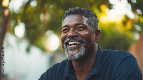 Man expressing delighted feeling, joyful and content, casual setting capturing relaxed happiness