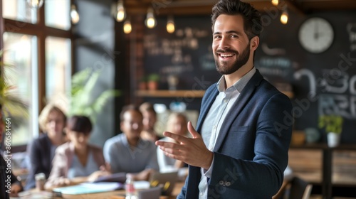 Man giving a presentation with smiling colleagues in a modern office.