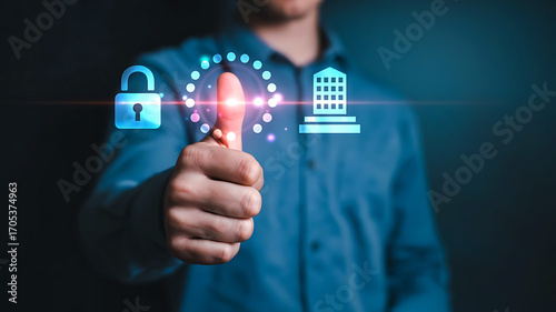 Man giving a thumbs up with digital security and building icons symbolizing protection and real estate investment