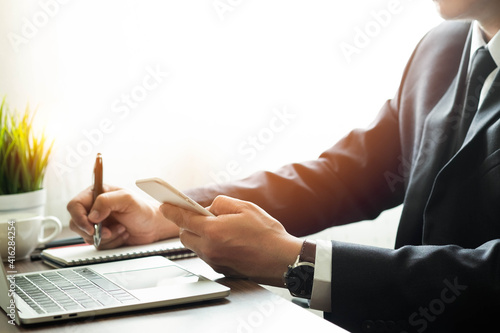 man hand holding mobile with writing pen memo into notebook paper on table desk office. Workplace for business and student, writer with copy space. business working and learning education concept.