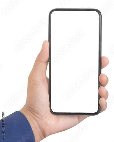 Man hand holding smart phone with blank screen isolated on transparent background.
