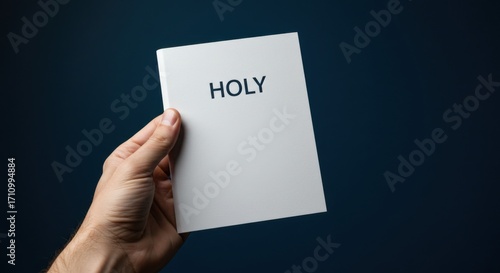 Man hand holding white holy book with dark blue background. Christian bible for prayer, religion, hope, faith, worship in protestantism, catholicism.