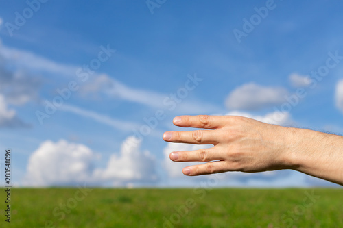 Man hand show the number four on the nature background