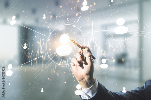 Man hand with pen working with abstract virtual social network hologram on blurred office background. Double exposure