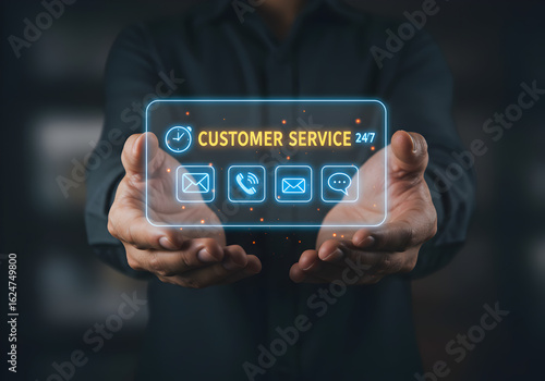 Man holding a glowing customer service interface with 24/7 support icons. Conceptual image for online assistance and communication.
