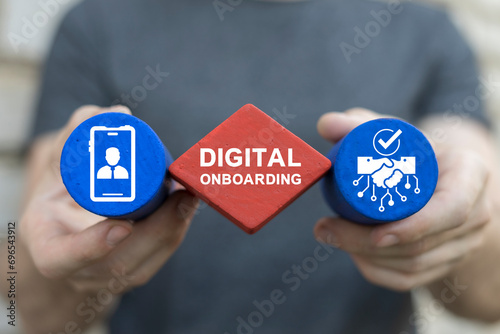 Man holding multi-colored blocks sees inscription: DIGITAL ONBOARDING. Digital Onboarding Talent Development concept. Welcome onboard online web service technology.