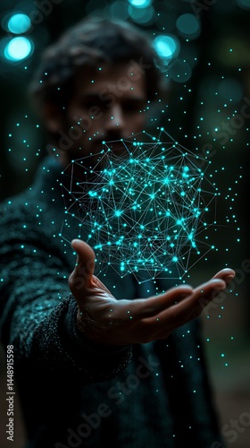 Man holding network sphere, forest background, technology concept