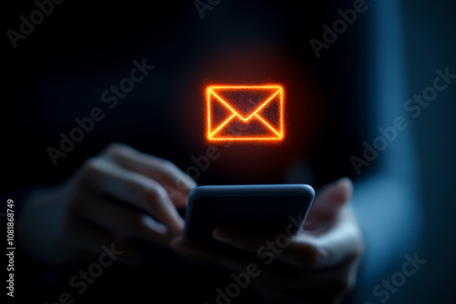 Man holding smartphone with digital network envelope icons and glowing connections. Concepts of communication, technology, digital messaging, and connectivity.